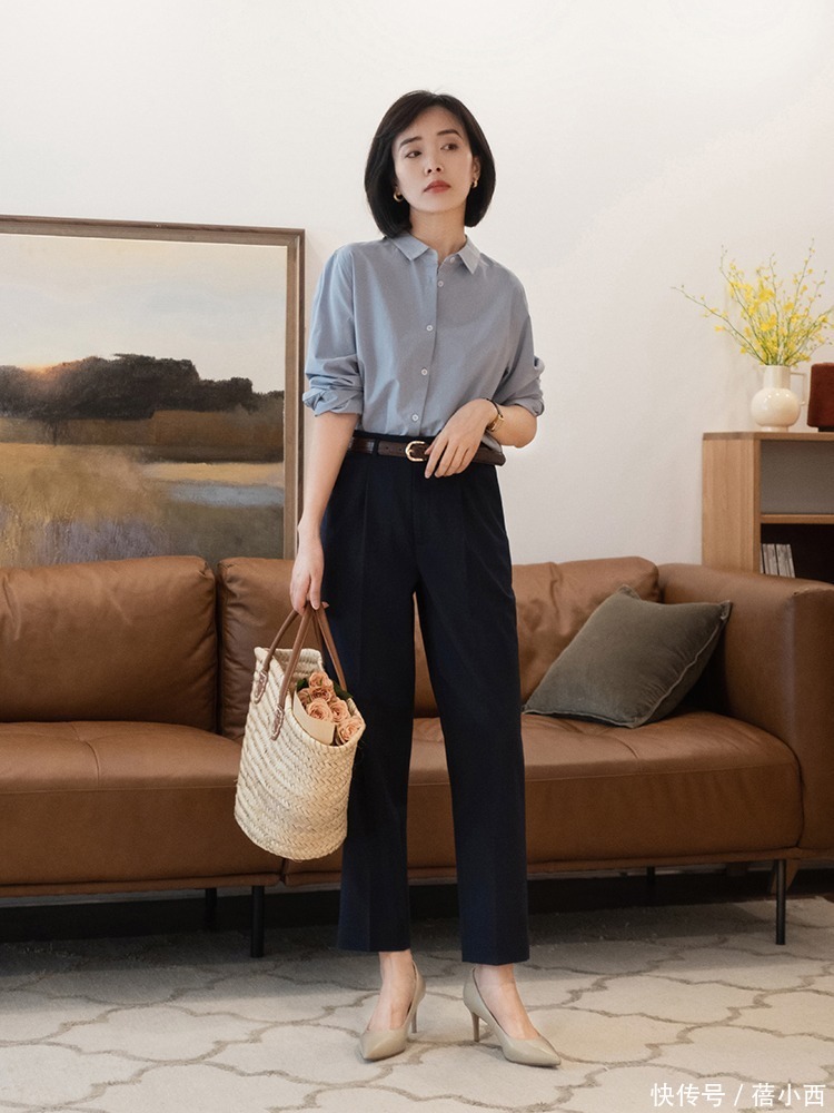 简单的蓝色衬衫搭配同款深蓝色西裤,这种裤型大要增多大气感,使得女性的气质愈加的突显,双蓝穿搭面子不复杂。