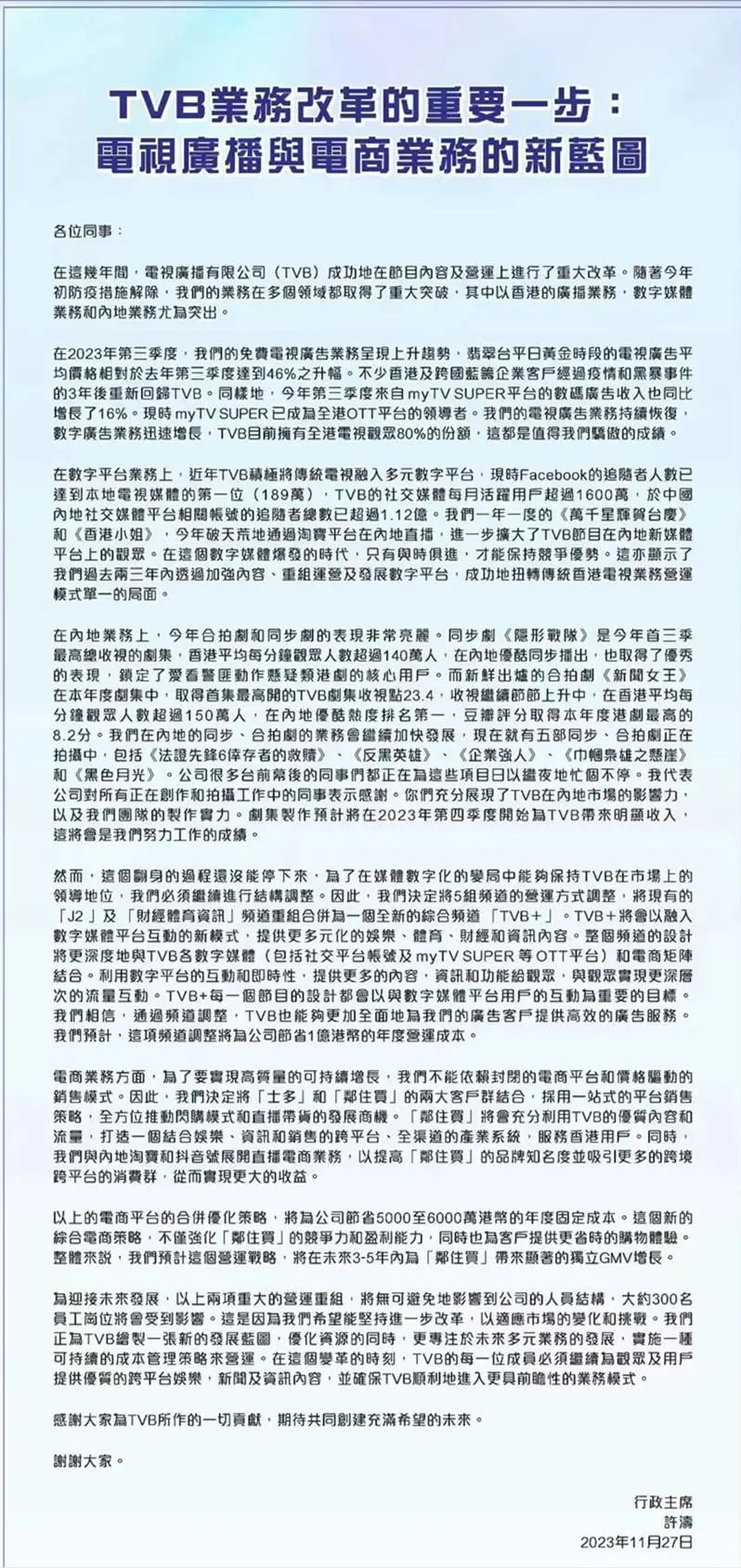 当晚,TVB行政主席许涛向里面职工发出公开信,他指以上两项要紧的营运重组,将无可幸免影响到公司的东谈主员结构,约莫300名职工岗亭将受到影响,但他称:“这是因为咱们但愿能坚捏进一步矫正,以适应市集的变化和挑战。咱们正为TVB画图一张新的发展蓝图,优化资源的同期,更专注于将来多元业务的发展,引申一种可捏续的老本处治计谋来营运。”许涛又暗示,在这个变革的时辰,TVB仍将不绝为不雅众及用户提供优质的跨平台文娱、新闻及资讯实践。