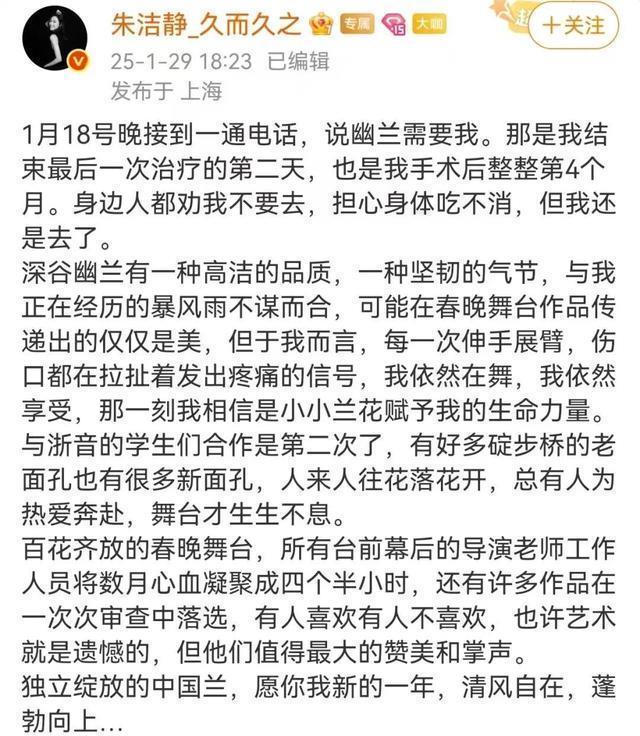 本年1月,朱洁静曾在春晚舞台上饰演跳舞《幽兰》后恢复病情。 她发文称:手术后整整第4个月。身边东谈主都劝我不要去,记念身体吃不用,但我如死去了。 山地幽兰有一种朴直的品性,一种将强的骨气,与我正在资格的狂风雨一口同声,可能在春晚舞台作品传递出的只是是好意思,但于我而言,每一次伸手展臂,伤口都在拉扯着发出痛苦的信号,我照旧在舞,我照旧享受,那一刻我服气是小小兰花赋予我的人命力量。